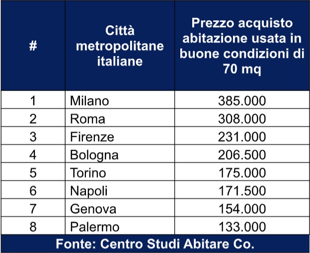 Prezzi medi per acquistare un’abitazione usata in buone condizioni di 70 mq in una delle 8 città metropolitane: